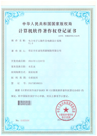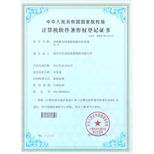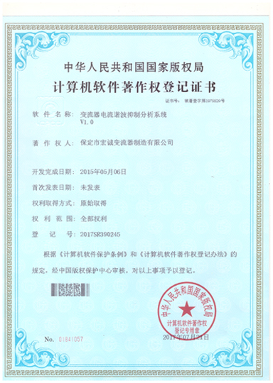 計(jì)算機(jī)軟件注冊權(quán)登記證書——變流器電流諧波抑制分析系統(tǒng)V1.0
