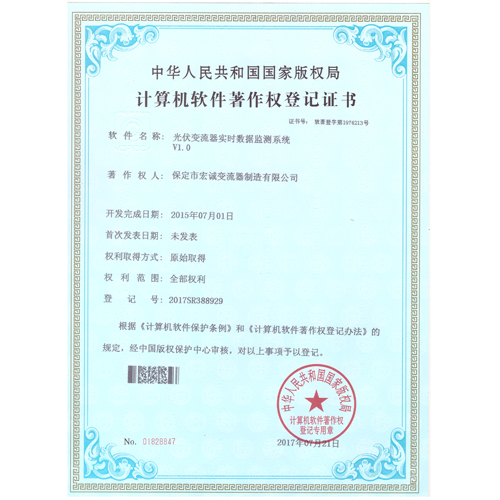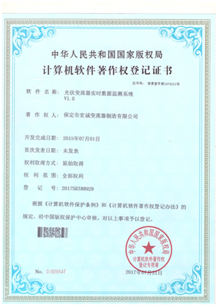 計(jì)算機(jī)軟件注冊權(quán)登記證書——光伏變流器實(shí)時(shí)數(shù)據(jù)檢測系統(tǒng)V1.0