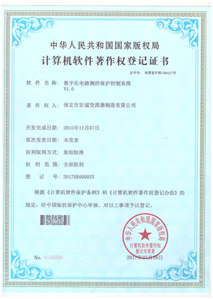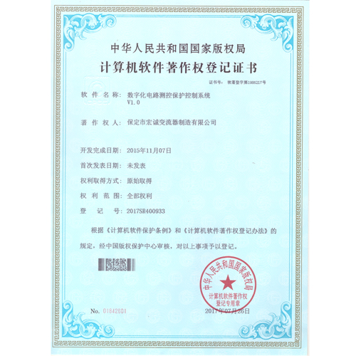 計(jì)算機(jī)軟件注冊權(quán)登記證書——數(shù)字化電路測控保護(hù)控制系統(tǒng)V1.0