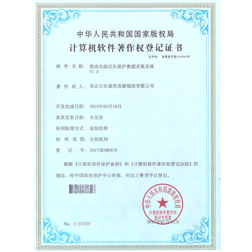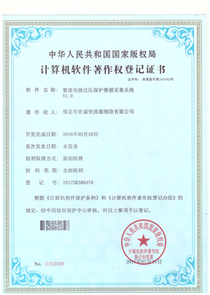 計(jì)算機(jī)軟件注冊權(quán)登記證書——整流電源過壓保護(hù)數(shù)據(jù)采集系統(tǒng)V1.0