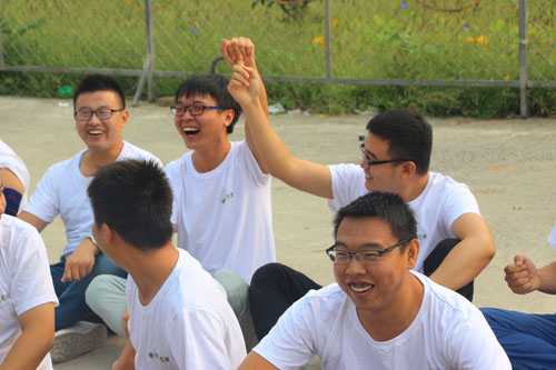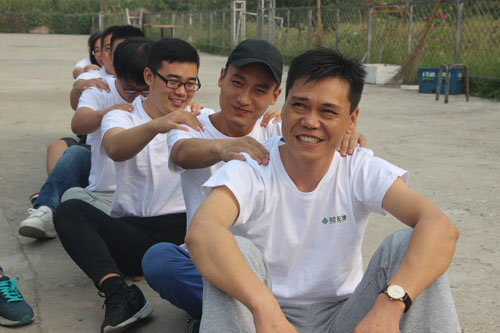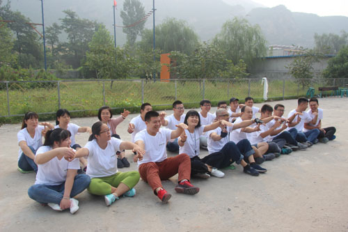 大家分成兩組坐在地上,為自己前方的人捏肩捶背,然后轉(zhuǎn)身向后輪換。游戲迅速消除了員工們的陌生感,營造了很好的拓展氛圍,奠定了團隊建設的基礎。